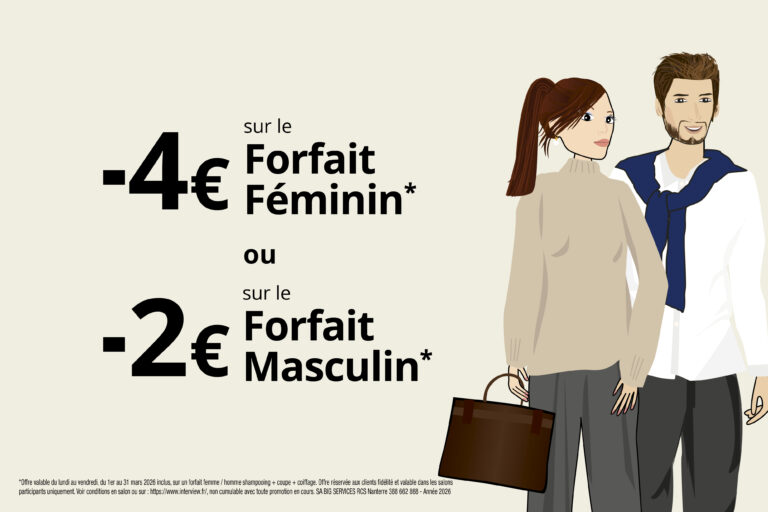 * Offre valable du 1er mars au 31 mars 2026 inclus sur un forfait femme/homme shampooing + coupe + coiffage, réservée aux clients fidélité. Non cumulable avec d’autres offres en cours et valable uniquement dans les salons participants.
